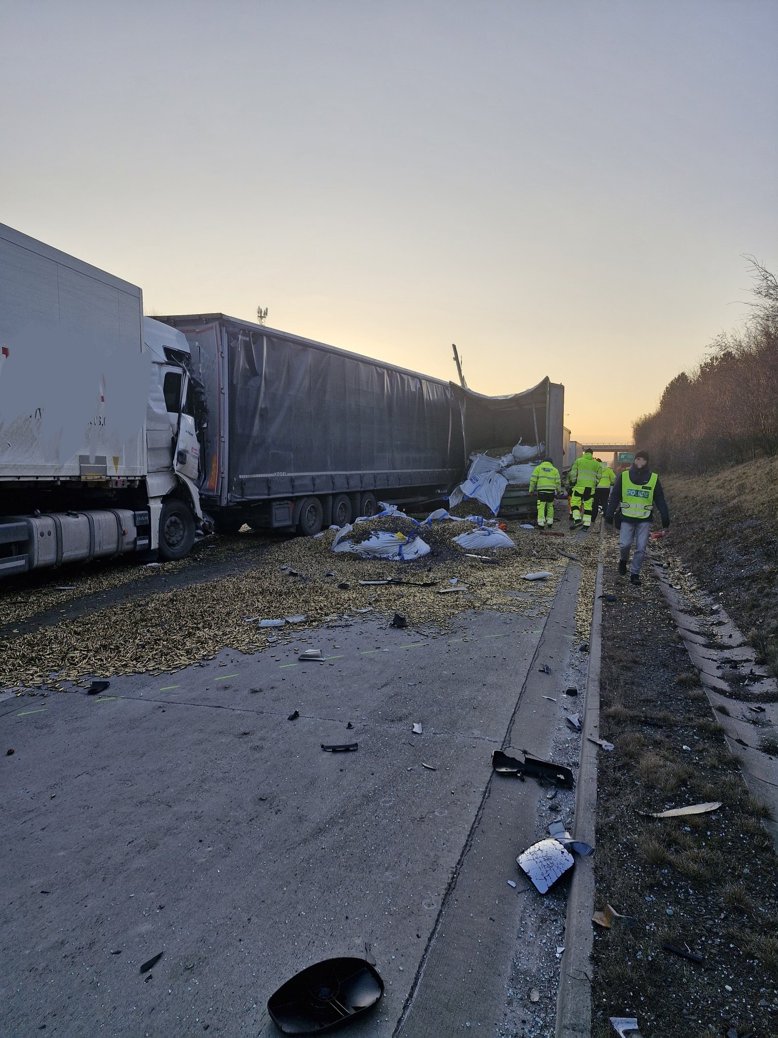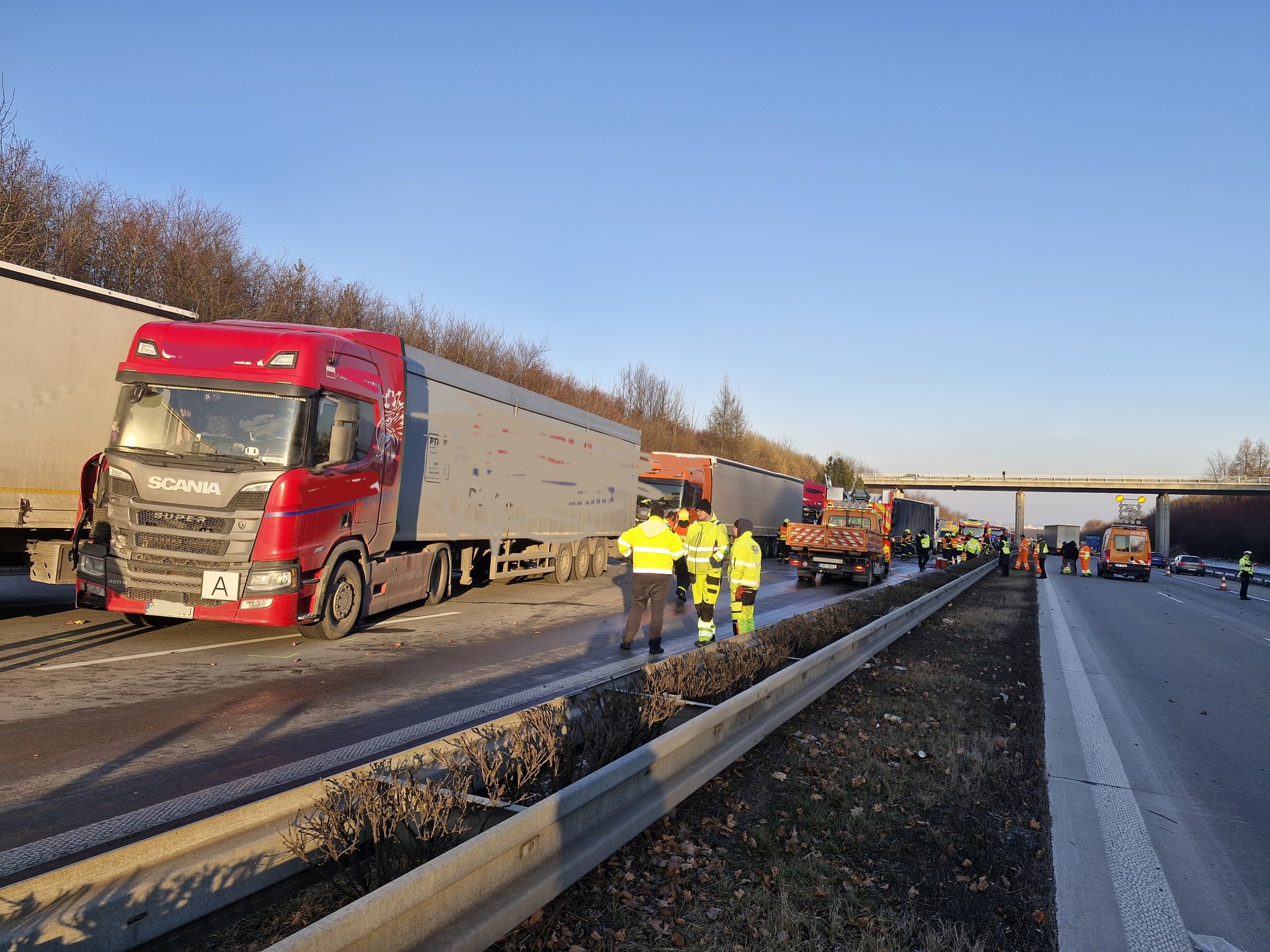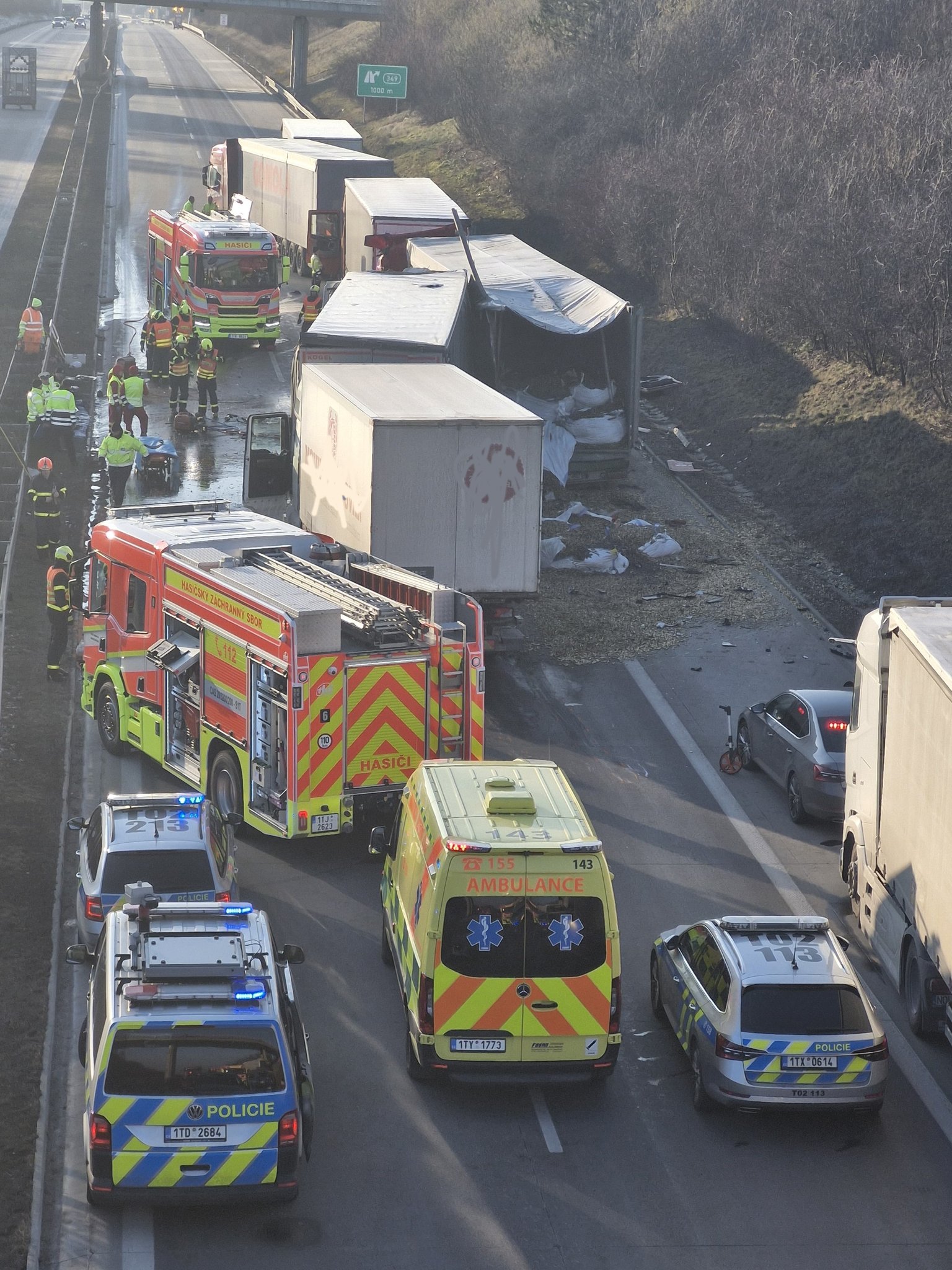Při nehodě se z jednoho z vozidel vysypal náklad v podobě prázdných nábojnic. Dálnice bude uzavřena ještě několik hodin do odklizení následků nehody.
