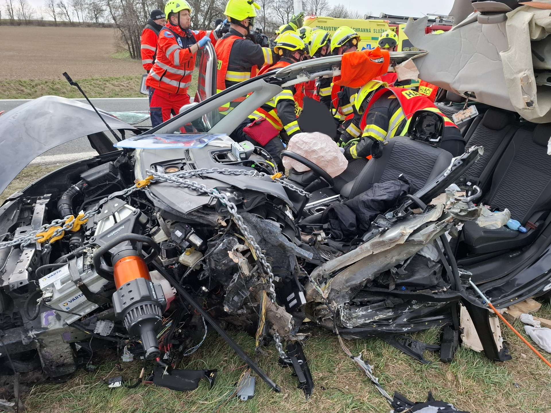 „Kvůli nepříznivě deformovaným zónám museli využít rozpínáky, nůžky, řetězy i hydraulické válce a pracovat rychle. Po odstranění dveří i střechy řidičku na páteřní desce předali záchranářům,“ popsala zásah mluvčí krajských hasičů Lucie Balážová.