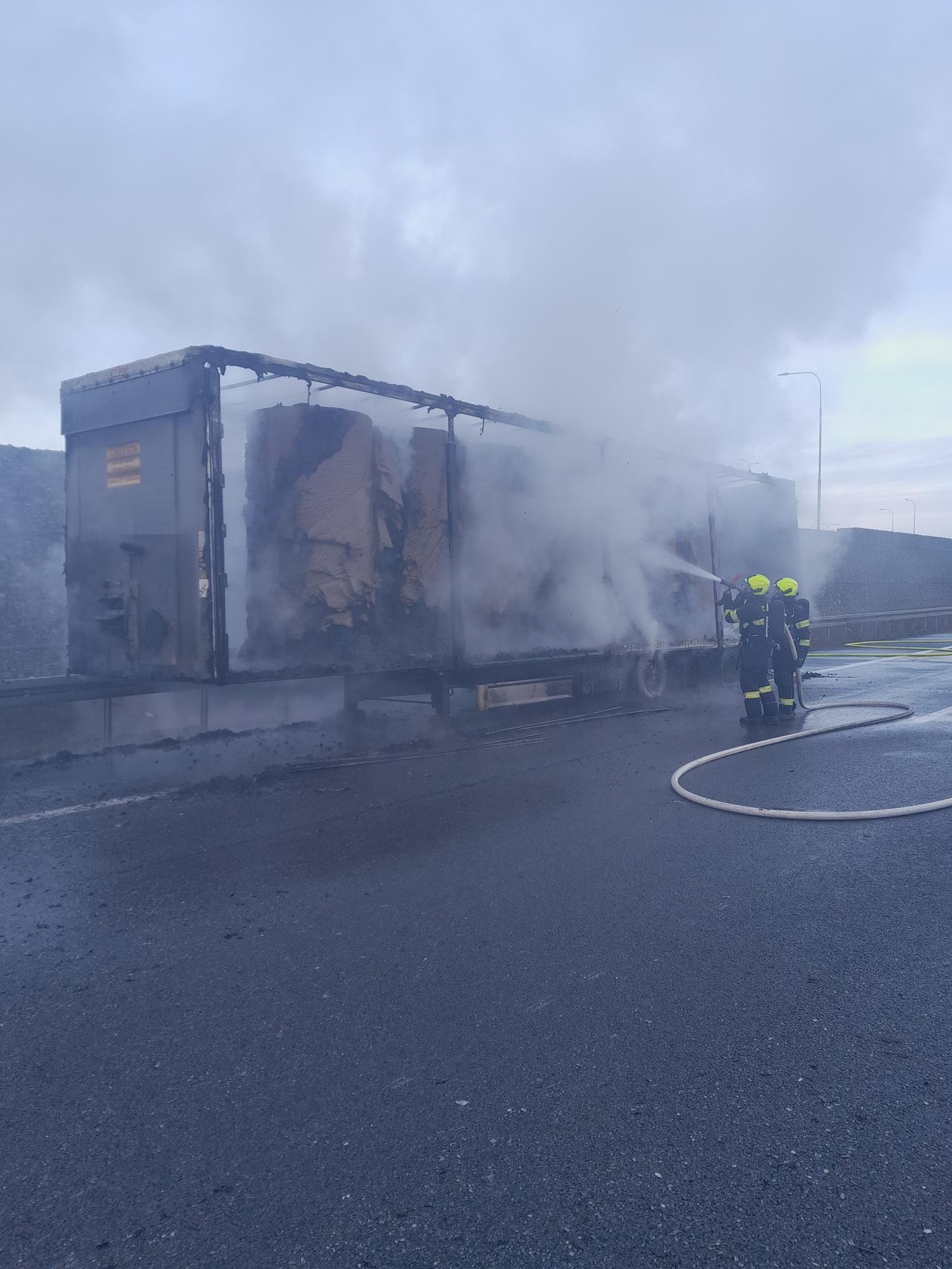 Zásah na místě je komplikovaný zejména kvůli povaze přepravovaného nákladu. Kamion byl totiž plně naložen lisovaným papírem v rolích. „Tento materiál se obecně velmi špatně hasí a k jeho uhašení je potřeba větší množství hasebních látek, v tomto případě vody,“ vysvětlili hasiči náročnost likvidace plamenů. Na místě operují profesionální sbor z Kralup nad Vltavou, podniková jednotka AERO Vodochody a dobrovolní hasiči z obcí Úžice a Dolínek.