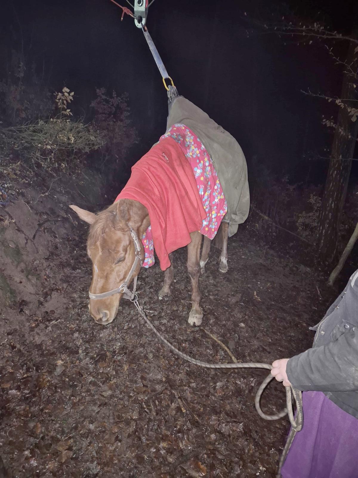 Kůň uváznul v náročném kamenitém lesním terénu a nemohl se postavit na nohy. Zasahující hasiči lanovými úvazky kolem trupu lichokopytníka zabezpečili a za pomoci ručního lanového navijáku a kladkostroje jej společnými silami přesunuli nejprve o několik metrů z toho nejnáročnějšího terénu.