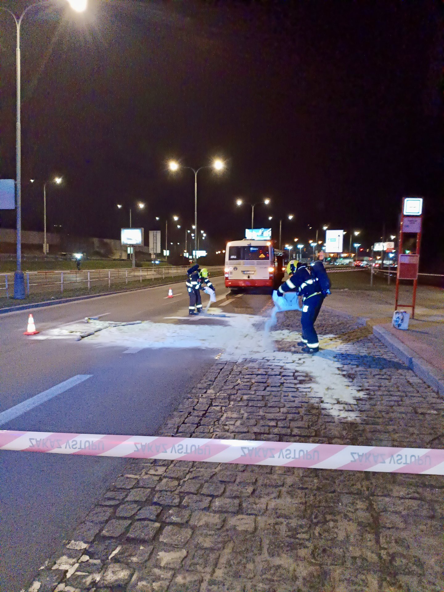 Specialisté z chemické služby identifikovali rozlitou látku jako kyselinu a okamžitě zahájili sanační práce. K odstranění kapaliny z povrchu zastávky použili hasiči sypký sorbent, který látku nasál a zabránil jejímu dalšímu šíření.