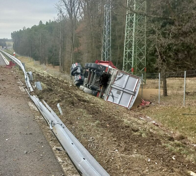Kaplice – Jihočeští policisté dnes ráno zasahovali u dopravní nehody na dálnici D3. Krátce po osmé hodině ranní došlo na 143. kilometru ve směru na Rakousko k havárii nákladního vozidla. Kamion sjel z vozovky a skončil převrácený na boku mimo těleso dálnice.