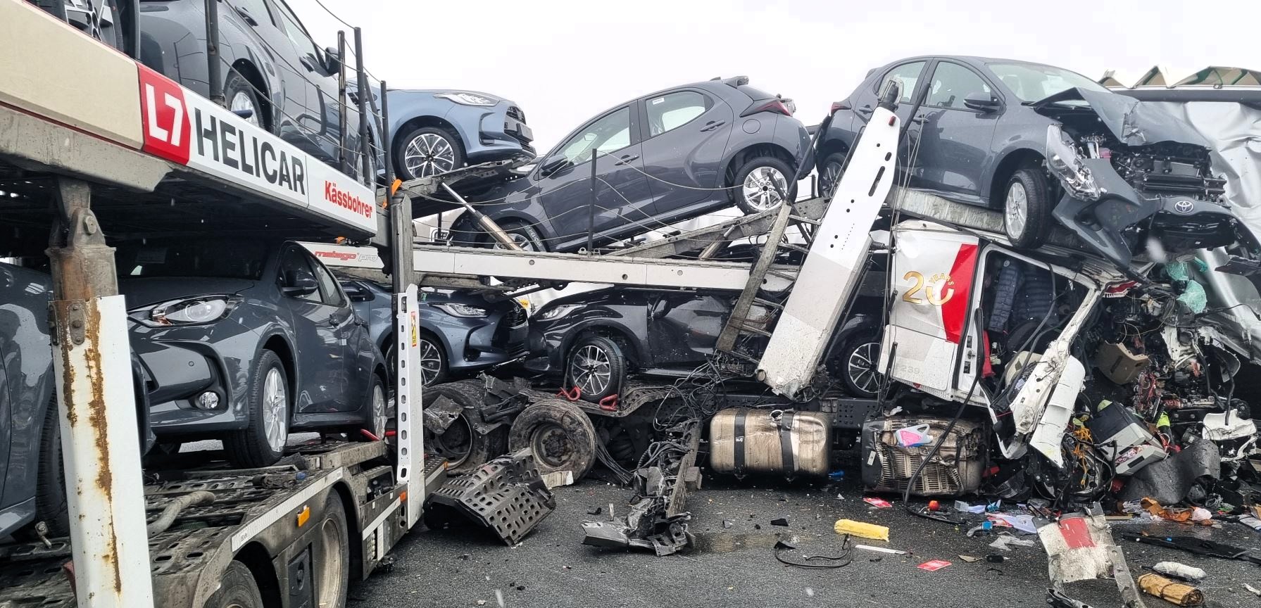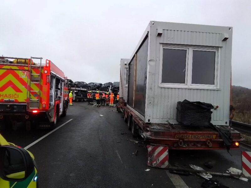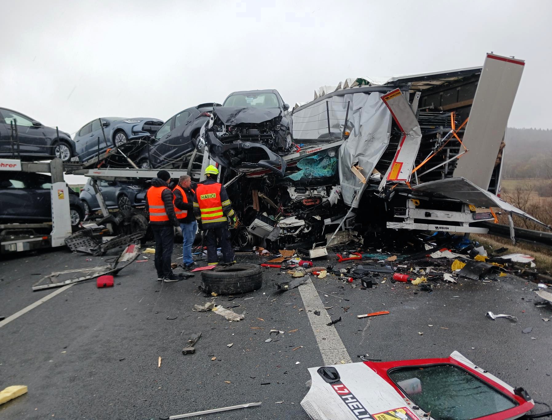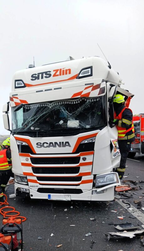 „Nehoda blokuje průjezd hlavního tahu na Německo na 89,7 kilometru. Na místě zasahují čtyři jednotky požární ochrany. Jednoho z řidičů bylo nutné vyprostit. Nyní hasiči řeší úniky provozních kapalin,“ doplnili hasiči.