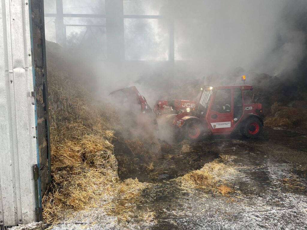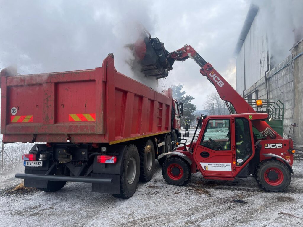 V sobotu ráno dorazila na místo další technika, včetně osmi kolového nákladního automobilu ze Záchranného útvaru Hlučín. Ten byl využit k odvážení sena a slámy z objektu, které hasiči následně prolévali vodou.