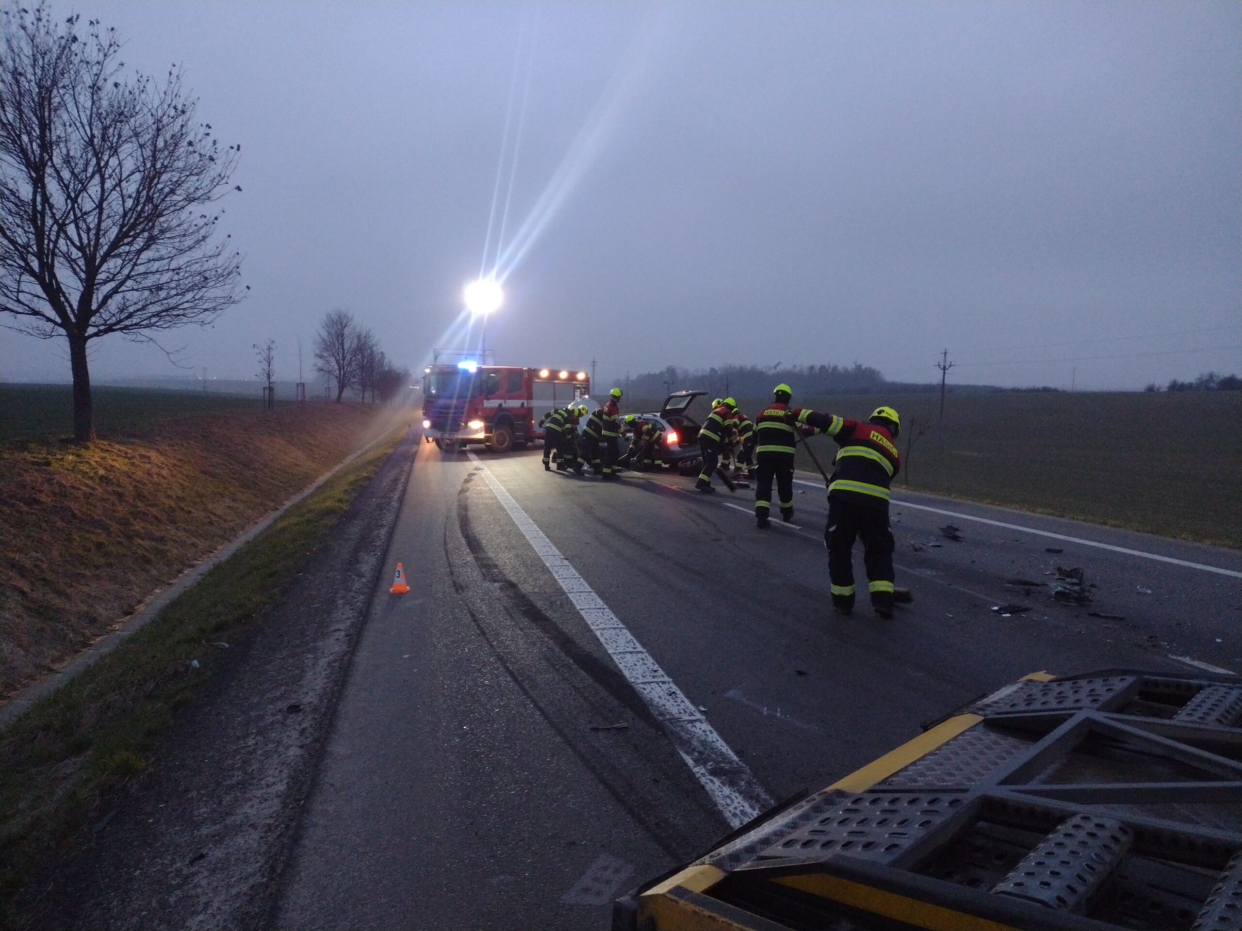 První hlášení o nehodě přijalo operační středisko v 5:25. Na místo byly okamžitě vyslány profesionální jednotky hasičů, které po příjezdu potvrdily, že havarované vozy zcela blokují průjezd.