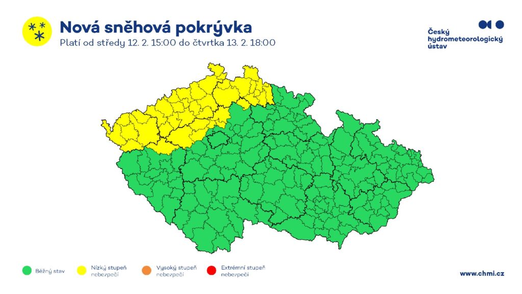Meteorologové rozšiřují výstrahu před ledovkou o části Karlovarského, Středočeského kraje a Prahu. Nově vyhlašují výstrahu před tvorbou nové sněhové pokrývky v severozápadní polovině Čech. Do čtvrtečního večera se bude na našem území vyskytovat občasné sněžení, při kterém v severozápadní polovině Čech napadne 8 až 15 cm nového sněhu.