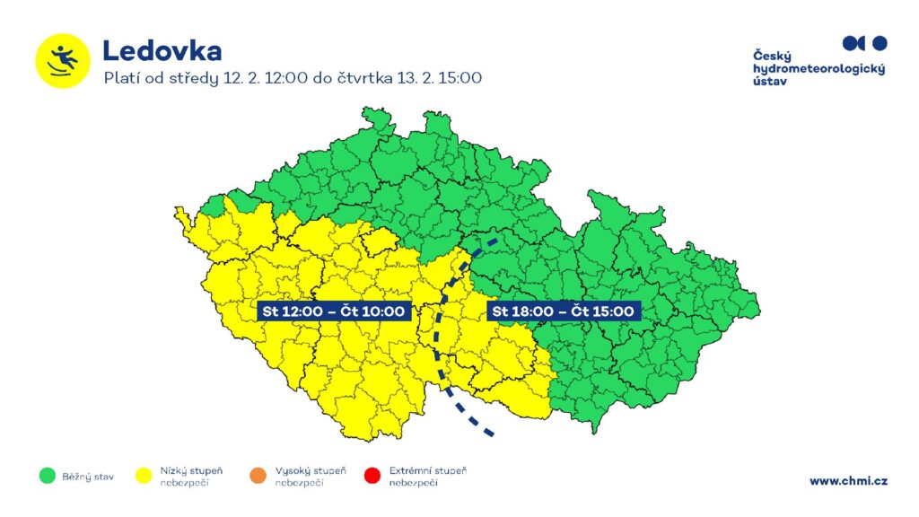 V jihozápadní polovině Čech ve středu v poledne, na Českomoravské vrchovině a na jihozápadě Moravy ve středu večer bude sněžení přecházet v mrznoucí déšť, při kterém se bude tvořit ledovka. Tvorba ledovky ustane v jihozápadní polovině Čech ve čtvrtek dopoledne, na Českomoravské vrchovině a na jihozápadě Moravy ve čtvrtek odpoledne.